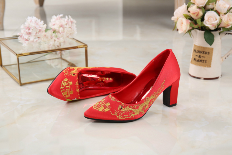 Red embroidered shoes for hire in a flower