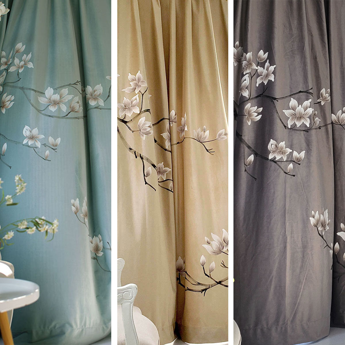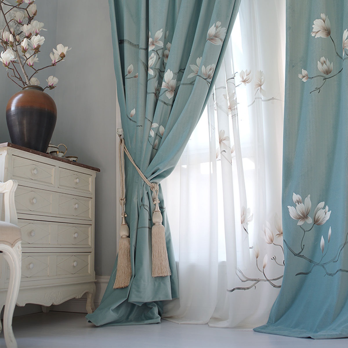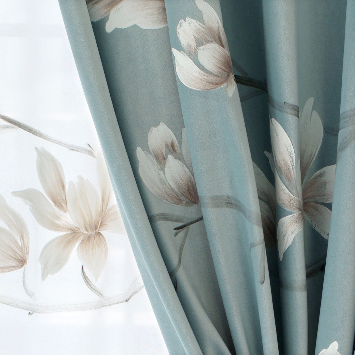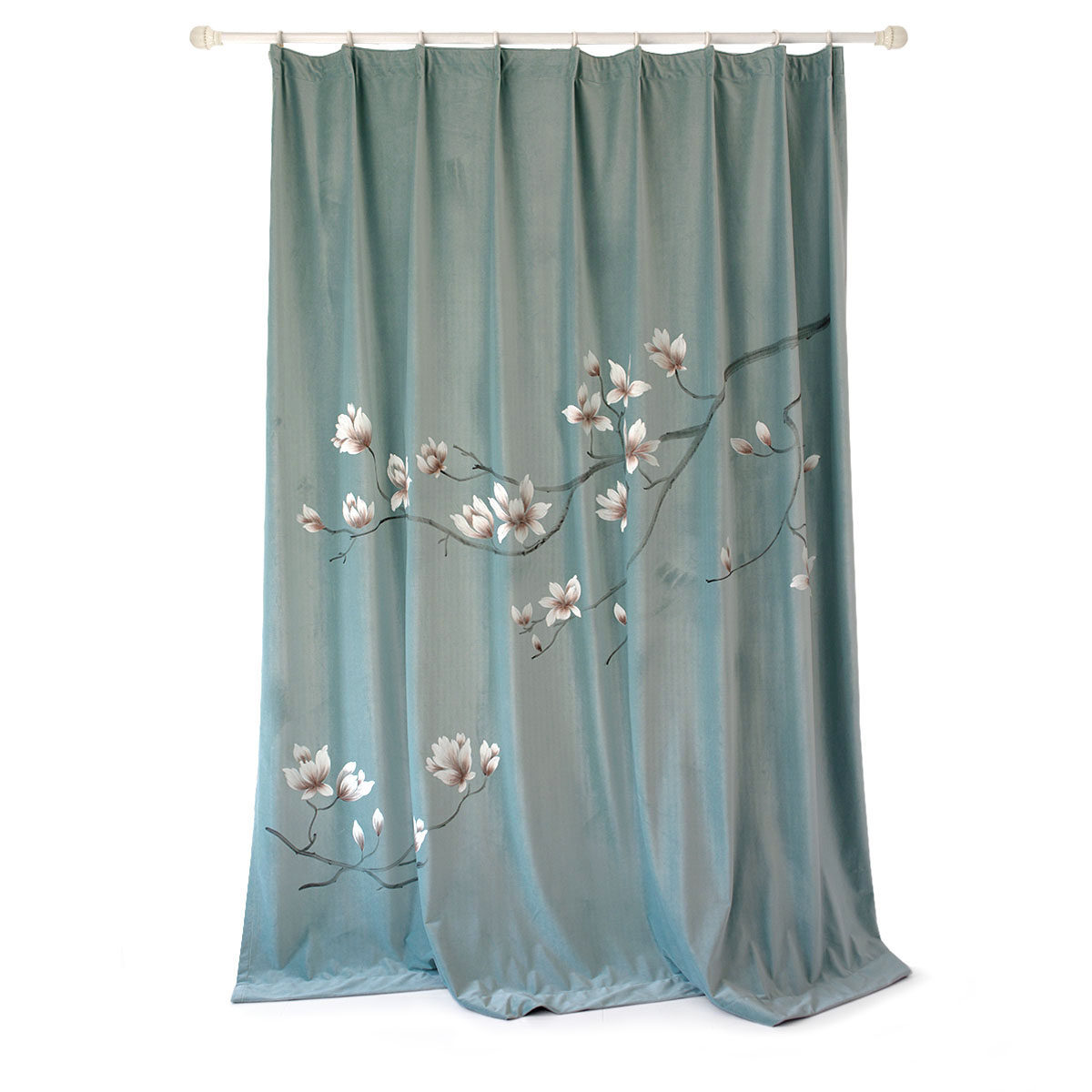Real hand drawing new Chinese modern fresh flower shade velvet high-end villa finished curtains can be customized white jalan