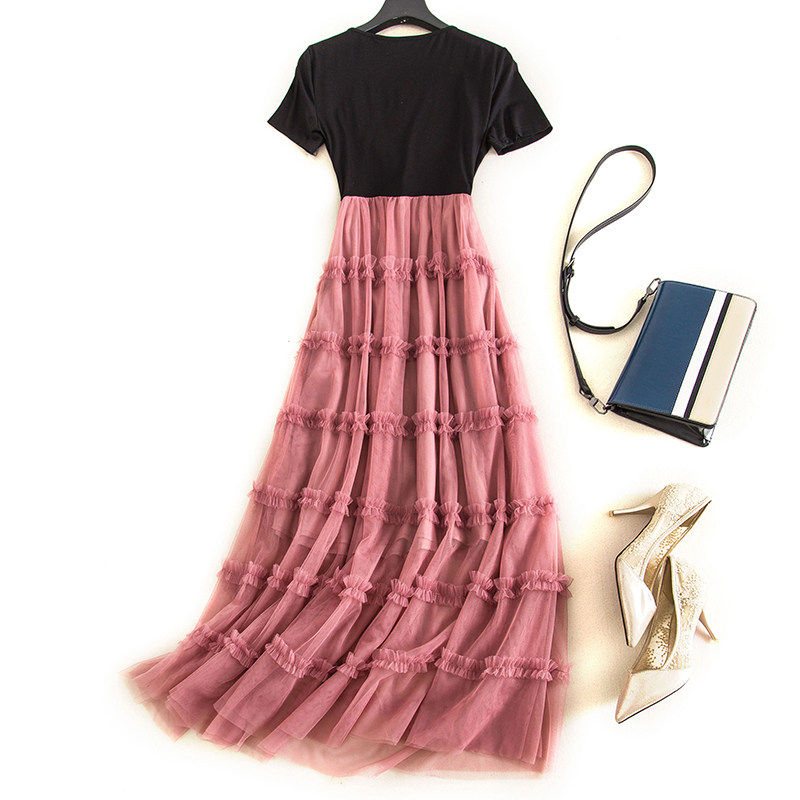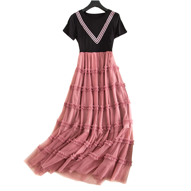 High-end fairy pure-color skirt 2022 summer new large-size women's clothing foreign style slightly fat belly-covering thin mesh dress