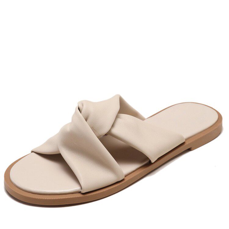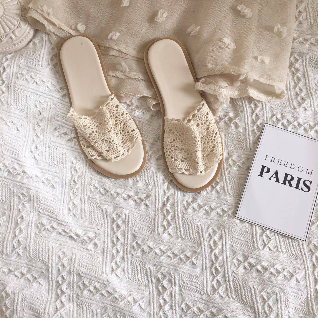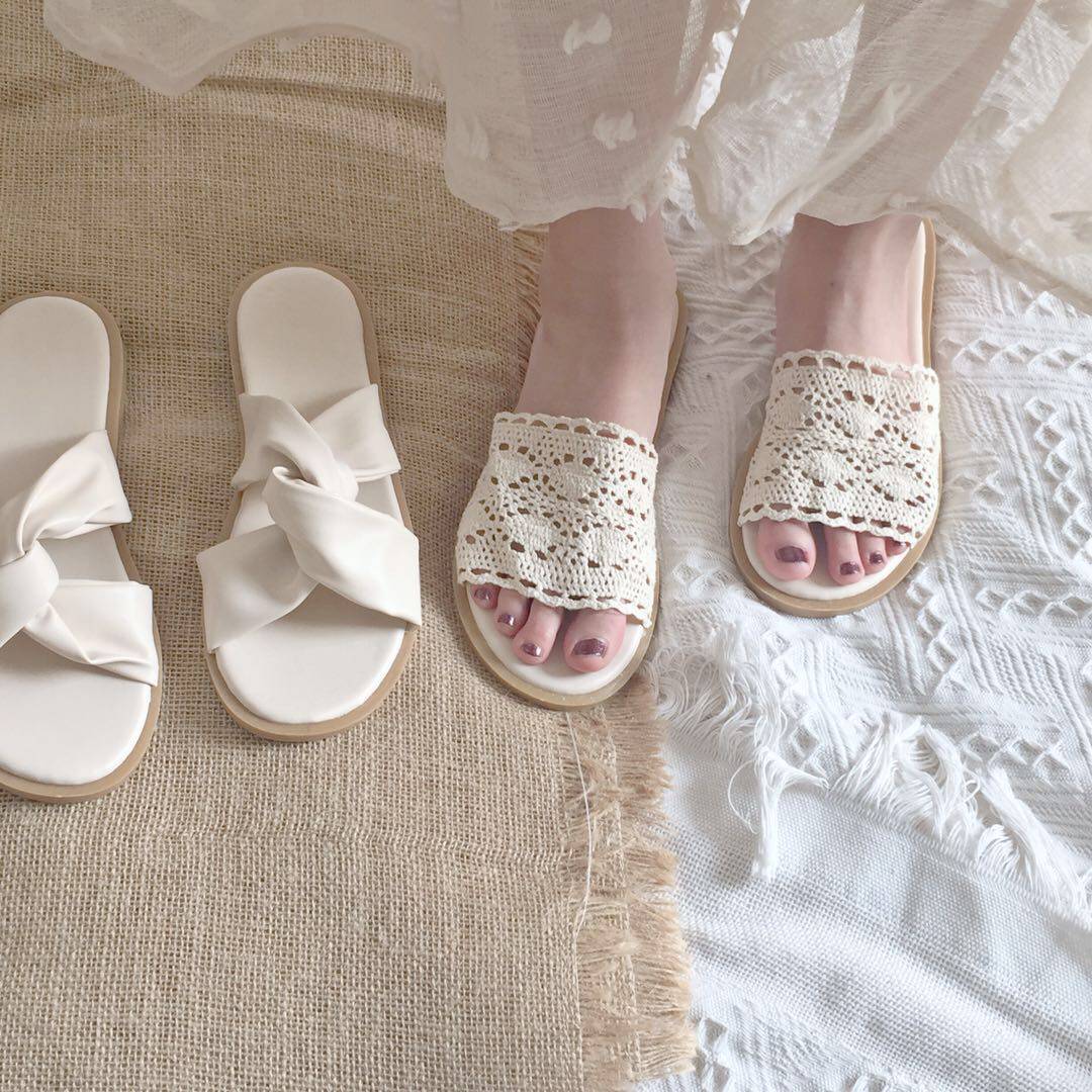 Korean Temperament Chic 100 Hitch Hollowed-out Lace Cross-Toe Cool Slippers Fashion Flat Bottom Women's Summer Ensemble Small Slippers