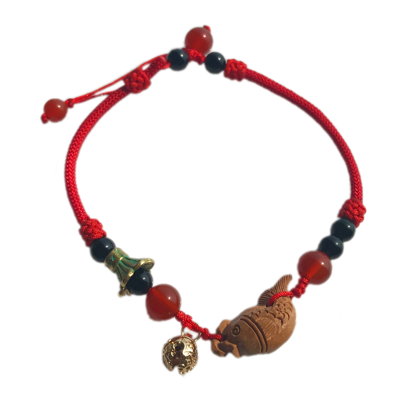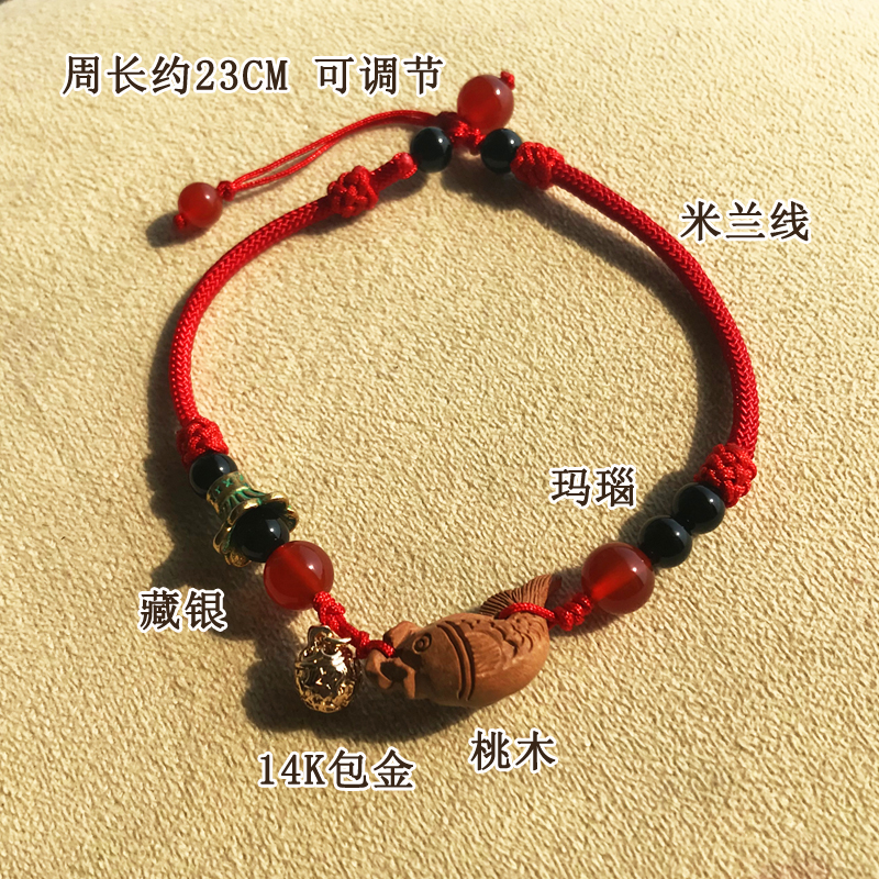 Pure Ornament Peach Wood Carp Red Rope Foot Chain Woman Agate 14k Bag Golden Bell Pepper to pray for a safe and fashionable retro style