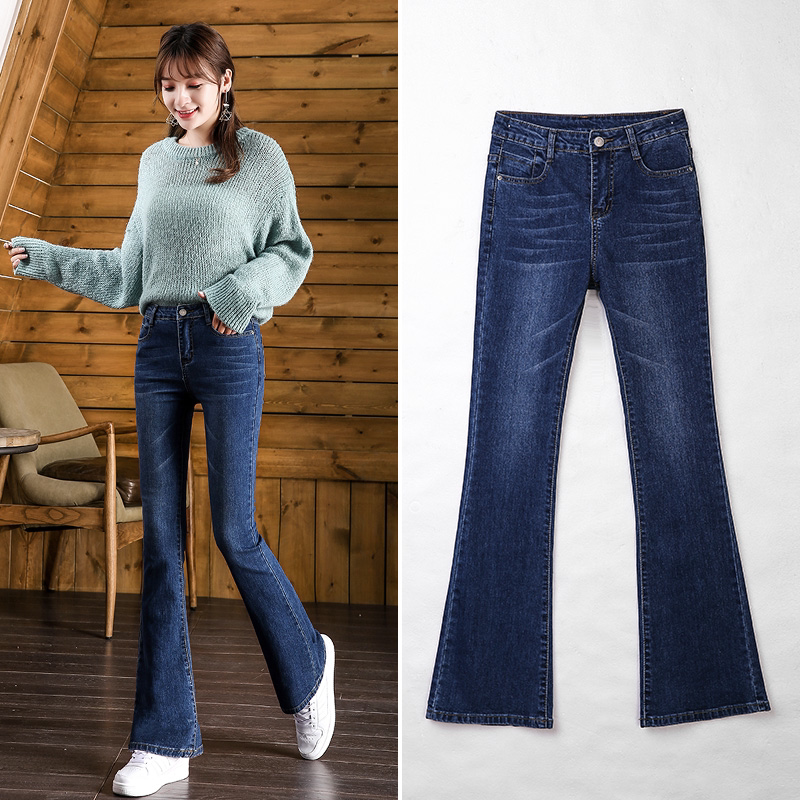 Weave jeans women's autumn new Korean version of the self-cultivation all-match high-waist flared trousers are thin blue split nine points tide