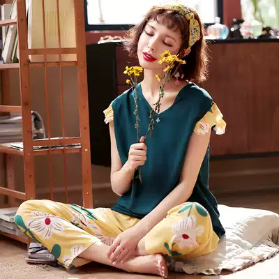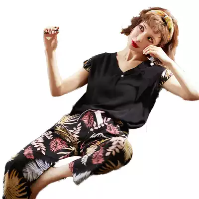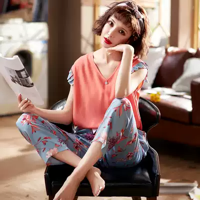 Fashion cotton silk pajamas women's spring and autumn summer short sleeve thin trousers set artificial cotton cotton cotton cotton silk home clothing two-piece set