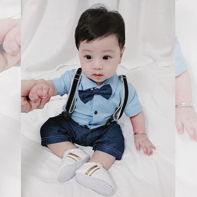 0-3 years old male baby boy baby boy newborn summer new denim cotton splicing bow gentlemen's bib pants