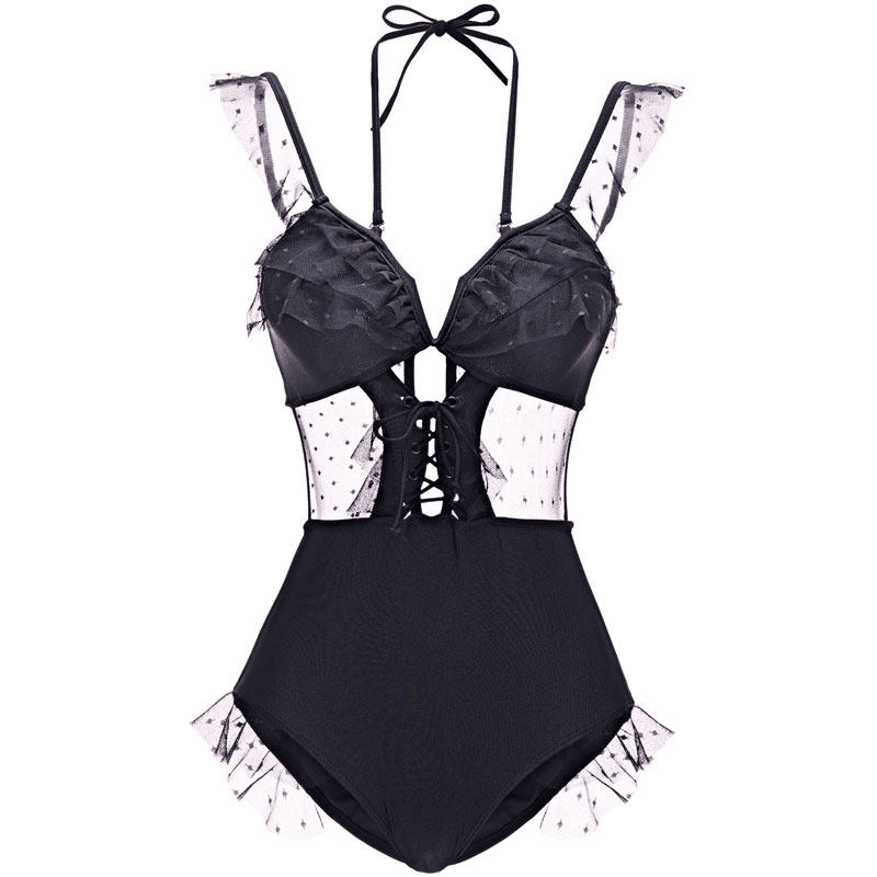 Lace one-piece swimsuit women's 2021 new sexy halter cover belly show thin chest gathered resort spa bathing suit