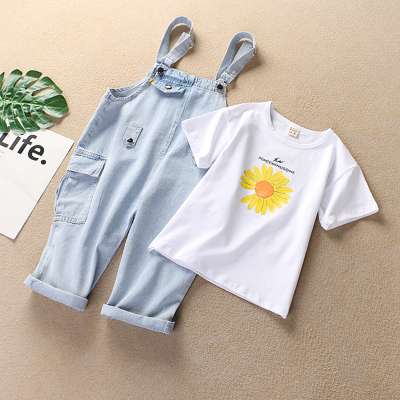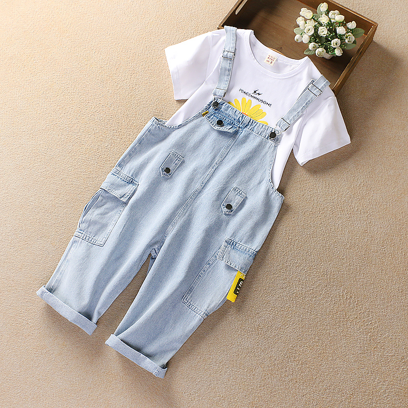 Girl Cowboy Cuddling Bag Pants Suit CUHK Children's Dress Foreign Pie Casual Girl Students Seven-Pants Summer Clothing Two Sets Thin