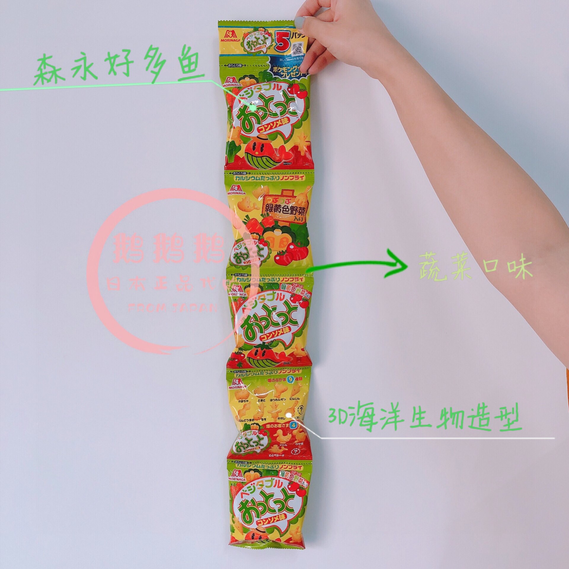 Japanese local Morinaga vegetable flavor baby children's snack hollow biscuit green dinosaur 3D shape 5 packs