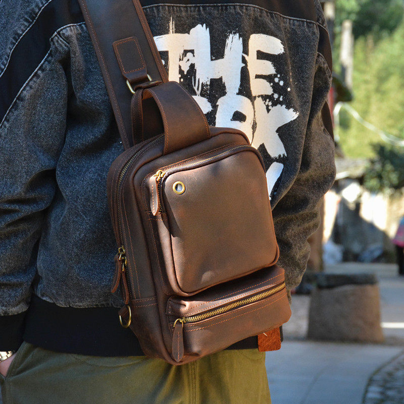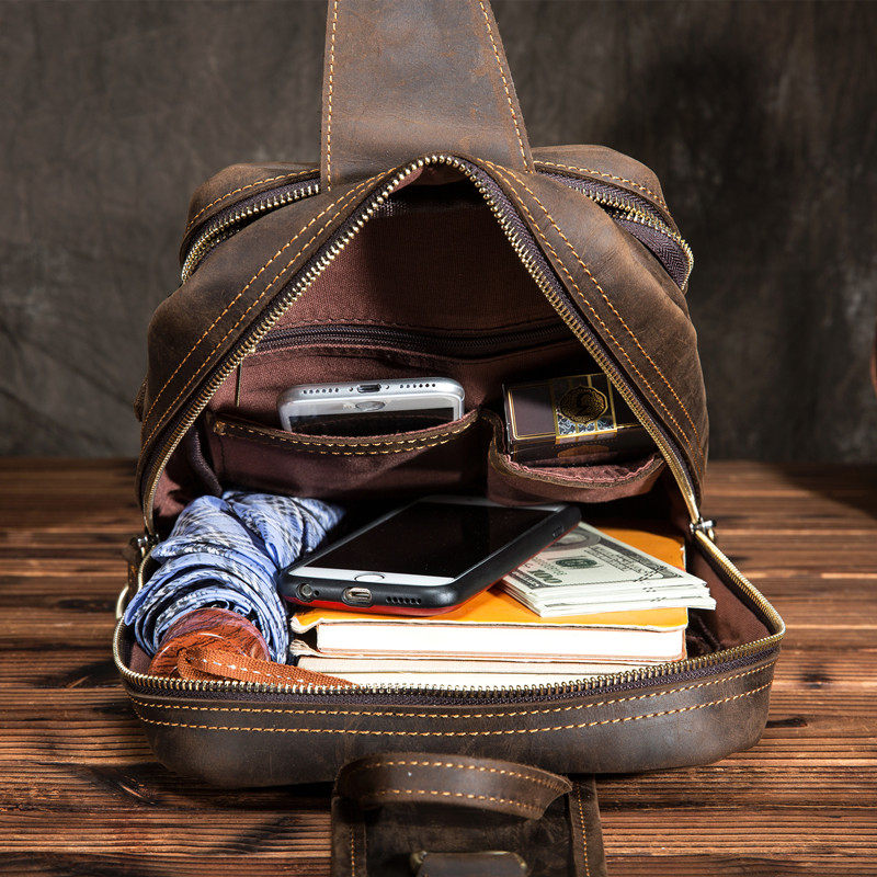 Original Retro Cowhide Diagonal Bag Crazy Horse Leather Large Capacity Men's Chest Bag Casual Shoulder Bag Genuine Leather Men's Bag Backpack