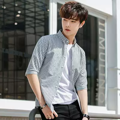 Summer plaid short-sleeved shirt men slim Korean version of the trend handsome 7 seven quarter sleeve inch shirt casual Half sleeve shirt