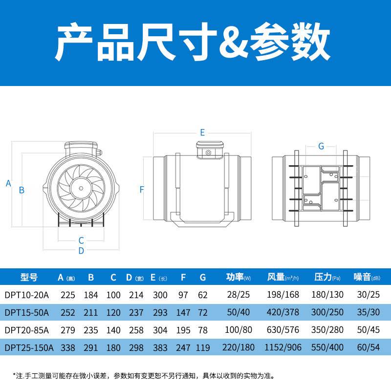 DPT10-20A (4 inch air volume 198) DPT15 -50A (6 inch air volume 420) DPT20-85A (8 inch air volume 630) DPT