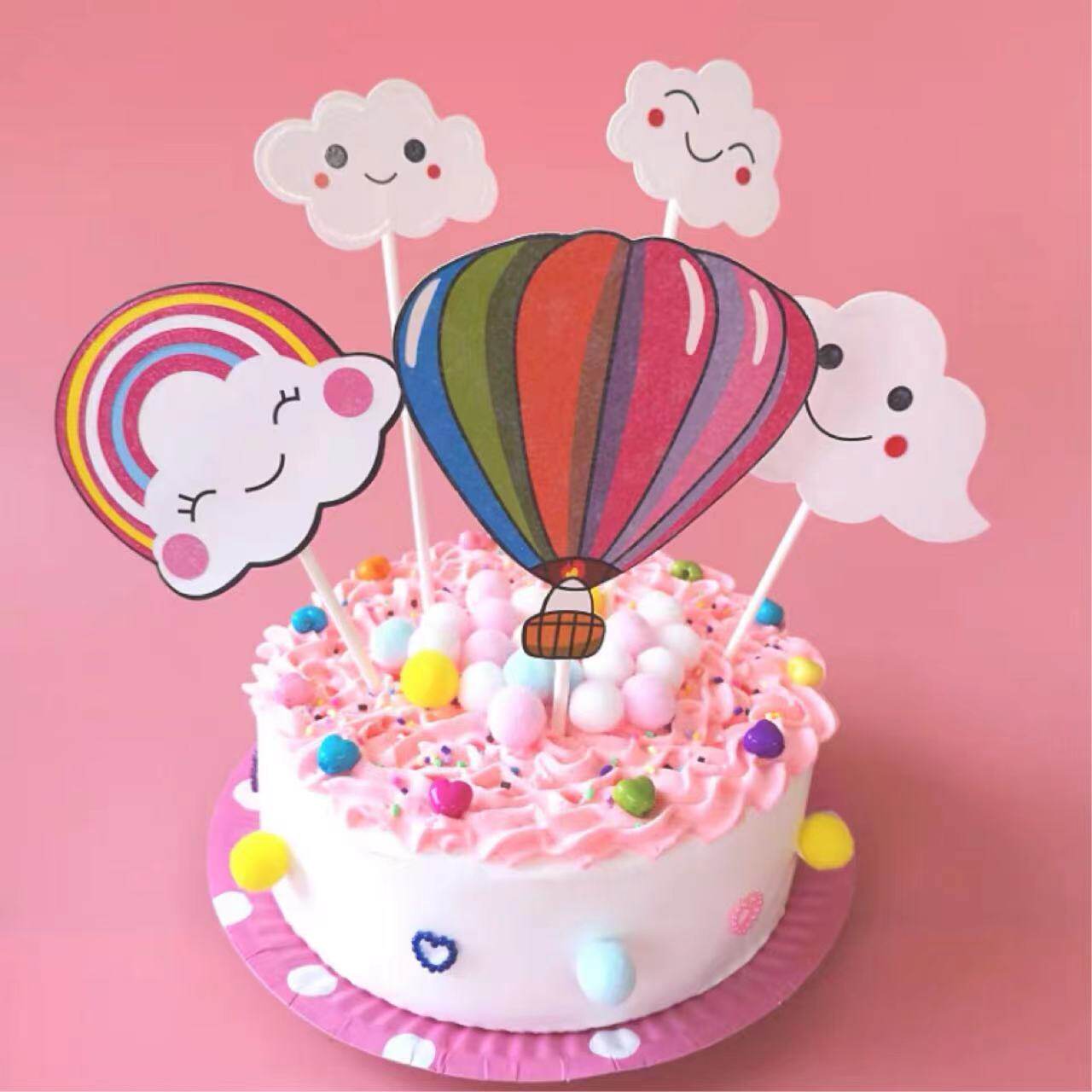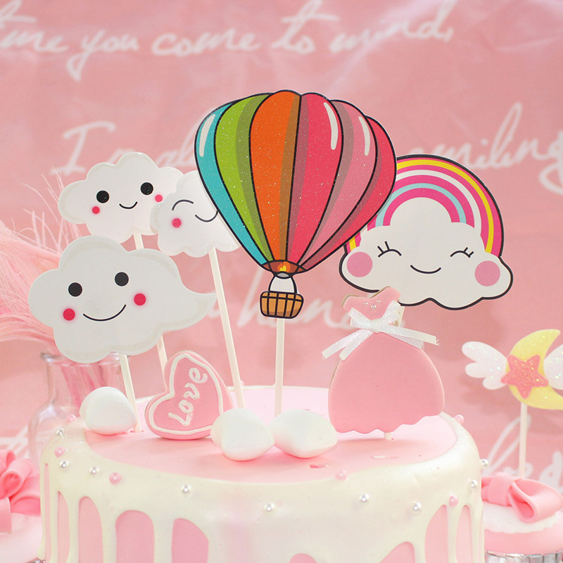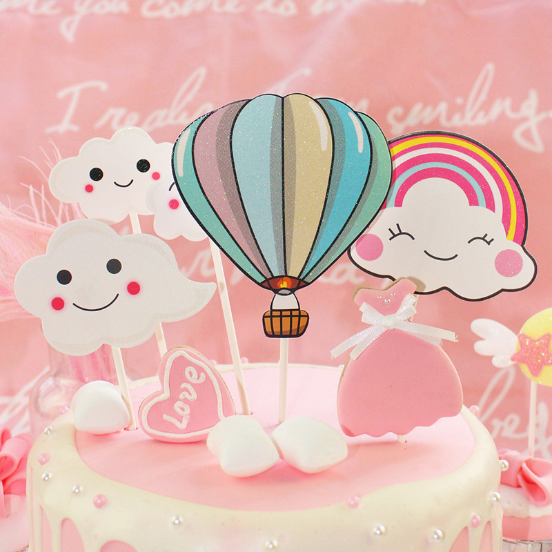 Hot Air Balloon Cake Decoration Plugin Cloud Seven Rainbow Happy Birthday Inserts Children Cartoon Baking Dessert Dress