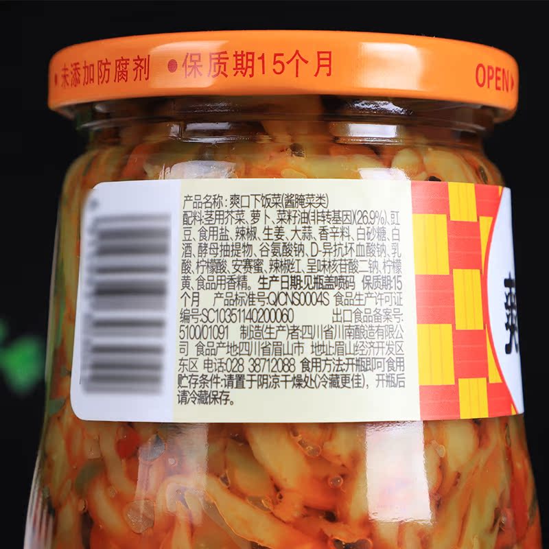 Stem mustard, radish, cowpea, rapeseed oil (non-GM) edible salt, pepper, ginger, garlic, spices, granulated sugar, white wine, yeast extract, flavoring, food additives