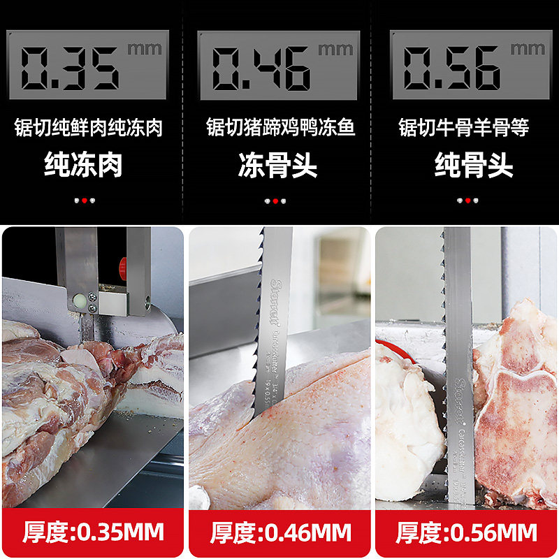 0.56 thickness suitable for sawing pure bones such as cattle bones and sheep bones width 16 * length 1650 * thickness 0.56 width 19 * length 2950 * thickness 0.56 width 16 * length 1200 * thickness 0.56 width 19 * length 2000 * thickness 0.56 width 16 * length 2000 * thickness 0.56 width 19 * length 2400 * thickness 0.56 thickness suitable for sawing pig's trotter chicken duck frozen fish etc width 16 * length 1650 * thickness 0.46 width 19 * length 2950 * thickness 0.46 width 16 * length 1200 * Thickness 0.46 width 19 * length 2000 * thickness 0.46 width 16 * length 2000 * thickness 0.46 width 19 * length 2400 * thickness 0.46 0.35 thickness suitable for sawing pure fresh meat pure frozen meat vegetables etc width 16 * length 1650 * thickness 0.35 width 16 * length 1200 * thickness 0.35 width 19 * length 2000 * thickness 0.35 width 16 * length 2000 * thickness 0.35 width 19 * length 2400 * thickness 0.35