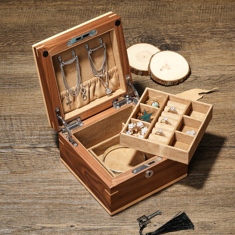 Black walnut solid wood jewelry box Solid wood double jewelry storage box Ring necklace ear needle collection box