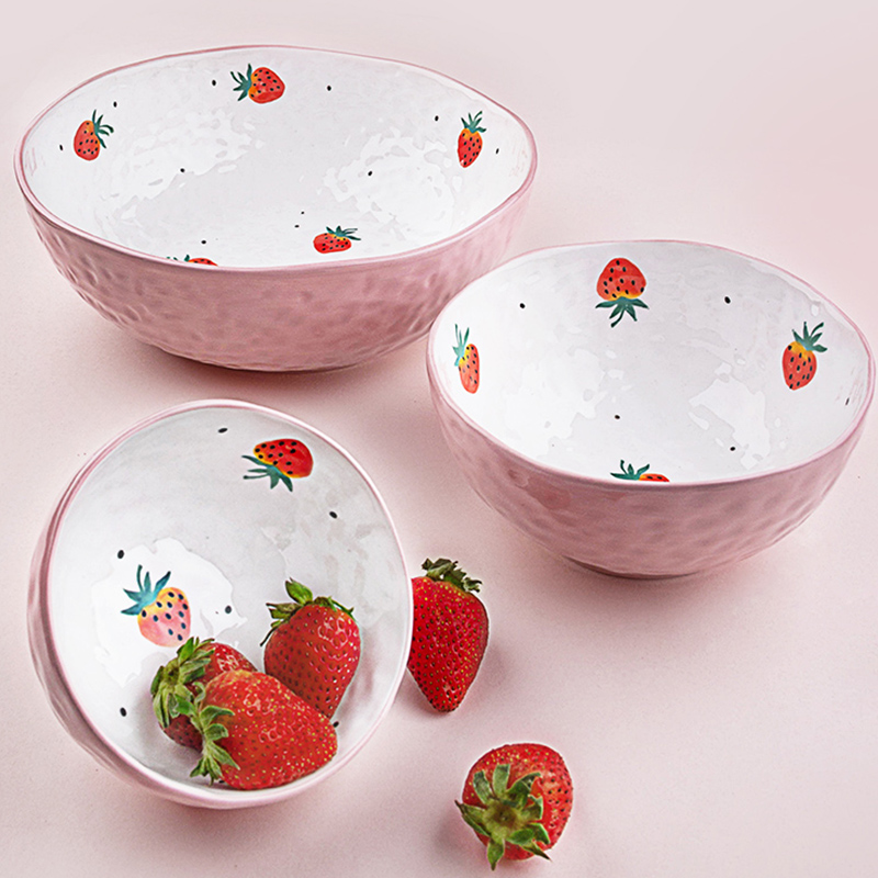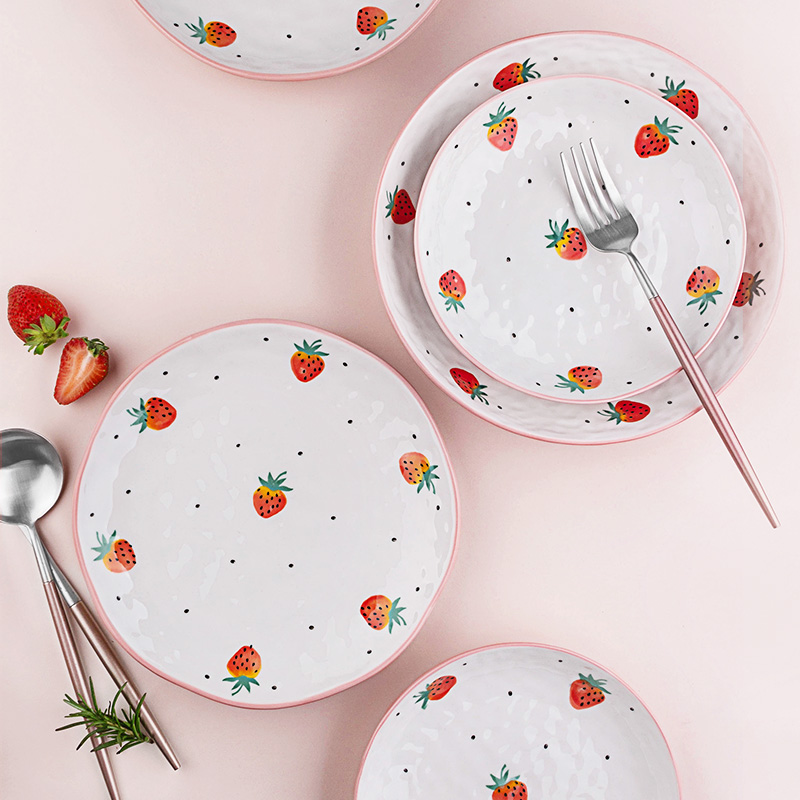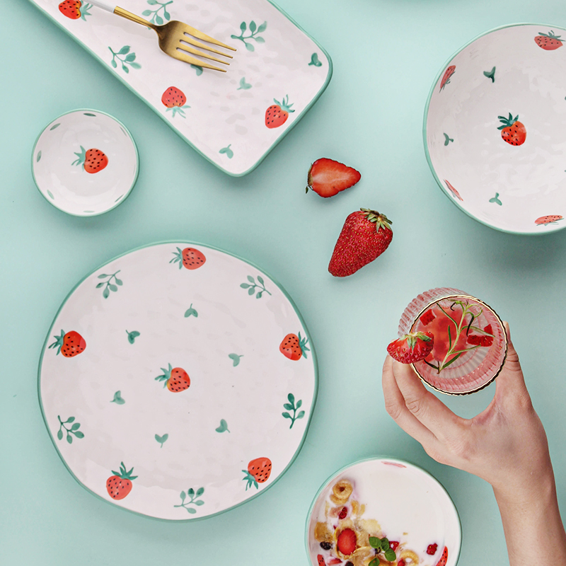 ezicok cute strawberry tableware Ceramic bowl plate Creative rice bowl Household simple plate plate Japanese breakfast plate