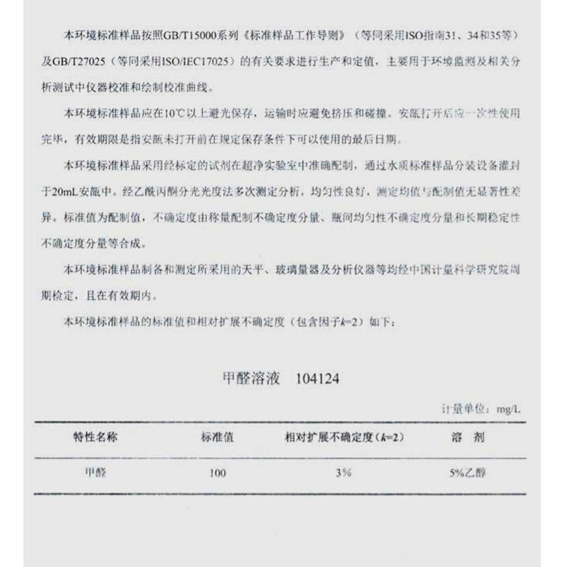 Formaldehyde water quality standard sample 0519 mg l formaldehyde water quality standard sample 1 58mg l (ring mark all) formaldehyde standard solution 100mg l other samples please consult customer service coast
