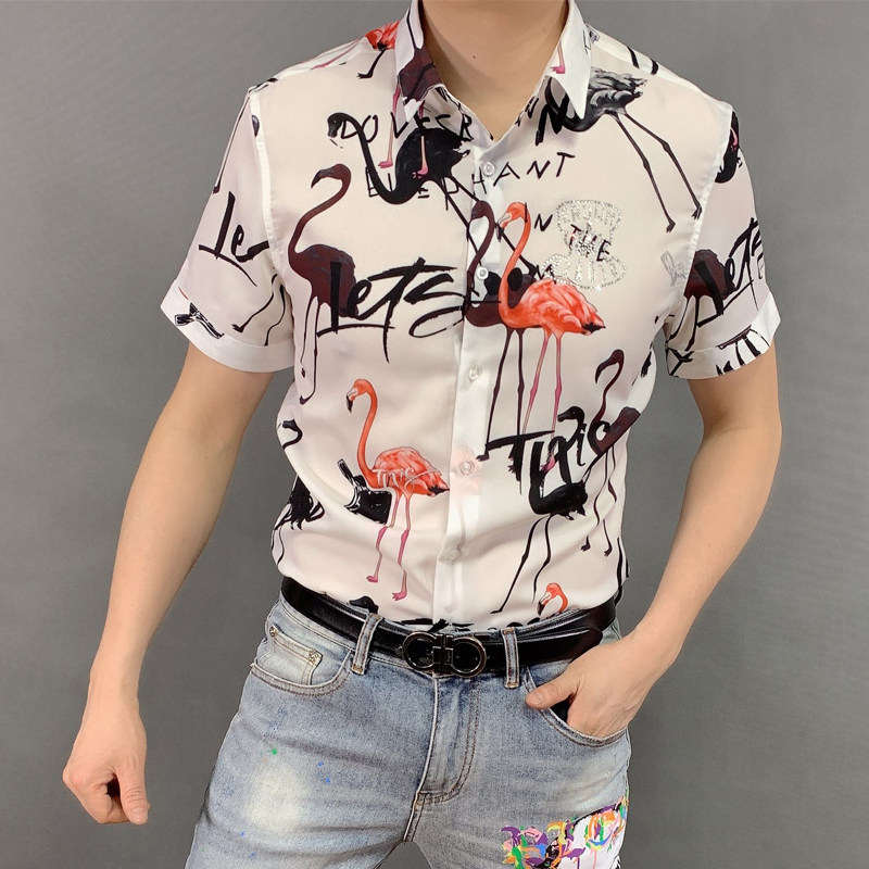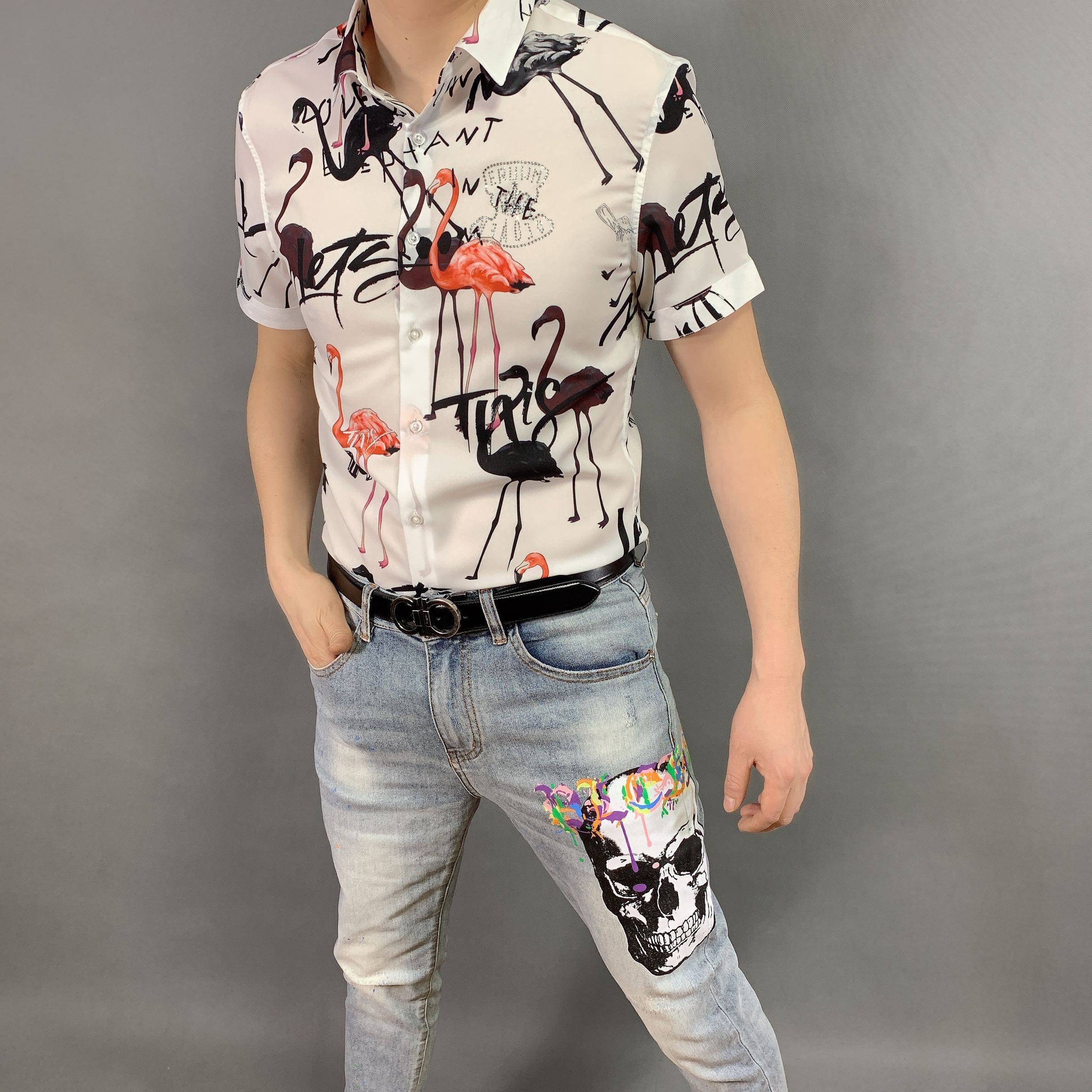 Men's color shirt 2019 Summer new European and American Wind fashion popular Korean version elastic body short sleeve white shirt