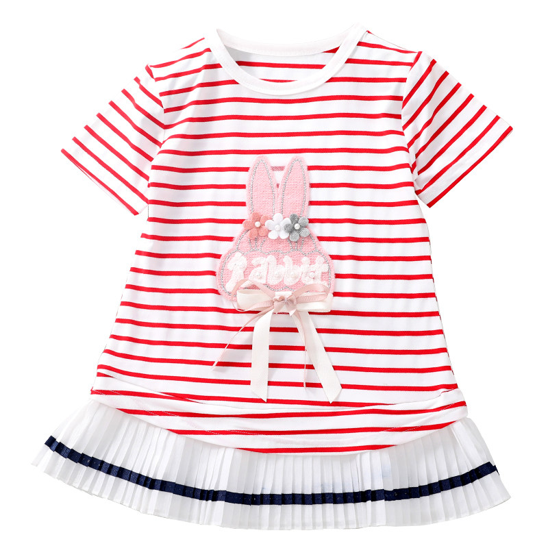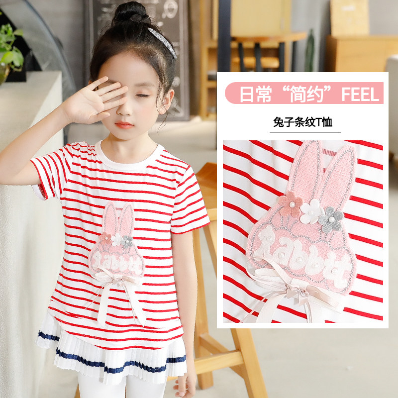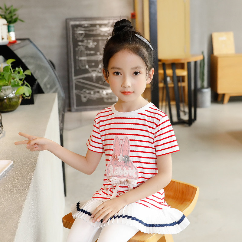 2023 Summer Girls Short Sleeve T - shirt New Children's Fold Dress to put on a long striped topper in a T - shirt baby
