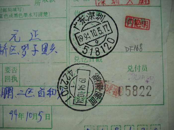 Stamp zip code stamp remittance slip DF168 Guangdong Shenzhen · 518120, next crescent 9 + long back 422201