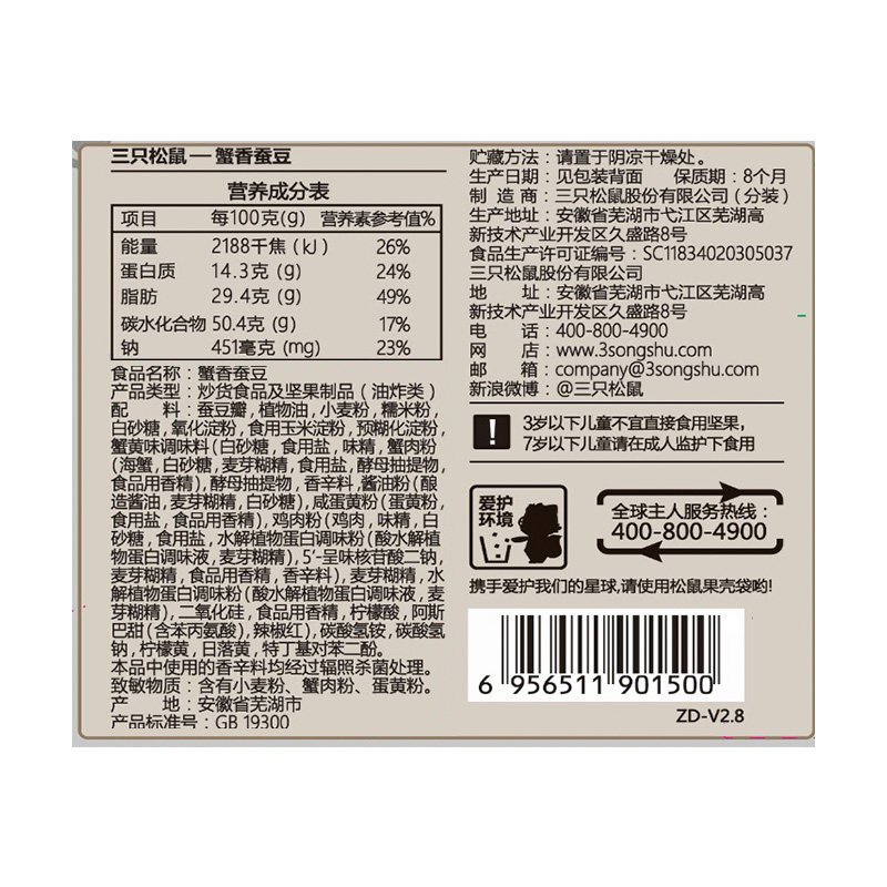 Three squirrels crab broad beans 205gx3 bags Snack nuts Fried food Net red food snack Crab watercress