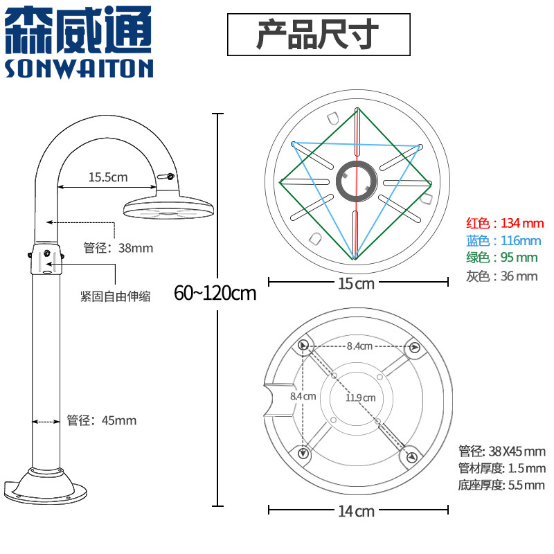Surveillance hemispheric camera telescopic bracket Haikang Dahua U-shaped 60-120cm aluminum alloy indoor and outdoor vertical installation