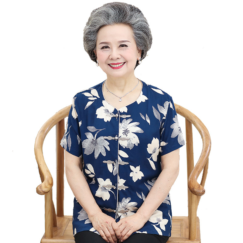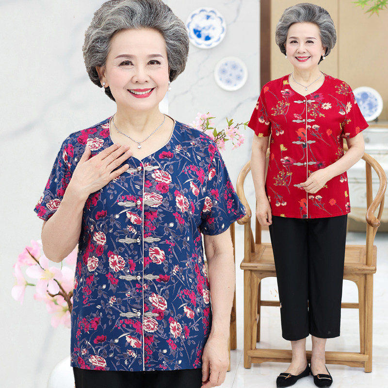 Grandma dress in summer clothing suit aged woman short sleeve old lady clothes 60 years 70 Mom clothes cotton silk two sets