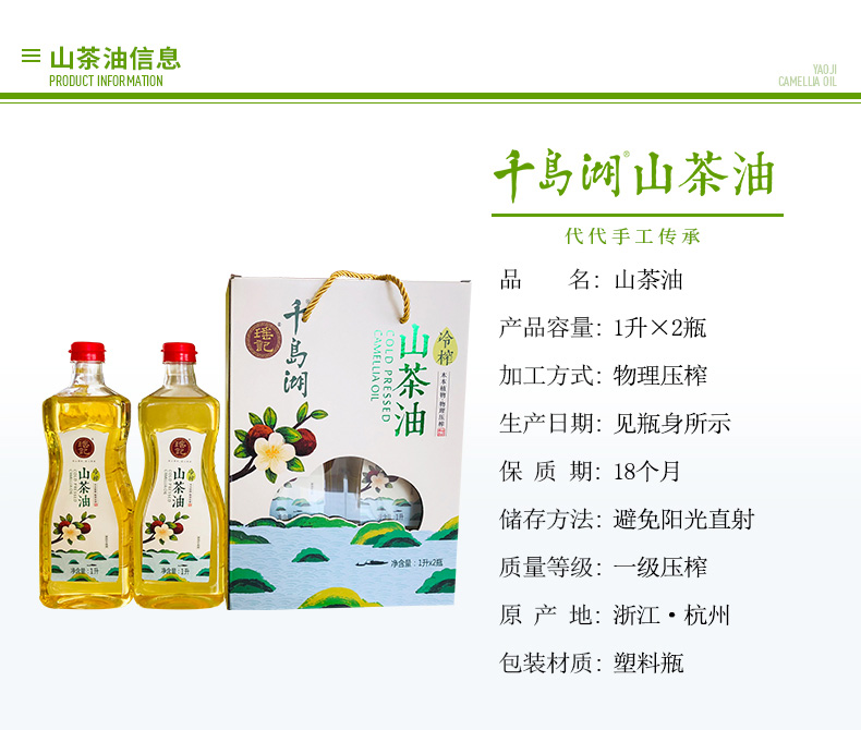 Yao Jingdao Hungzhou Hungzhou Lake Cold Press Mountain Tea Oil 1Lx 2 bottle of gift box physical pressing