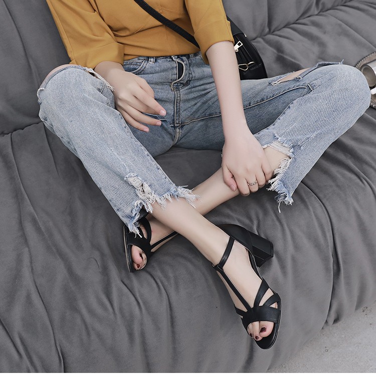 Fish mouth French hollow sandals women's summer leather cheongsam woven fashion coarse heels retro large shoes