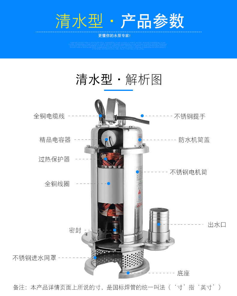 Clear water 750W 2 inch flow rate 10 head 16 meters 8 meters wire with thermal protection