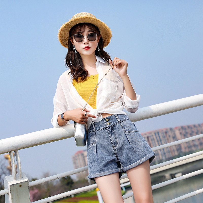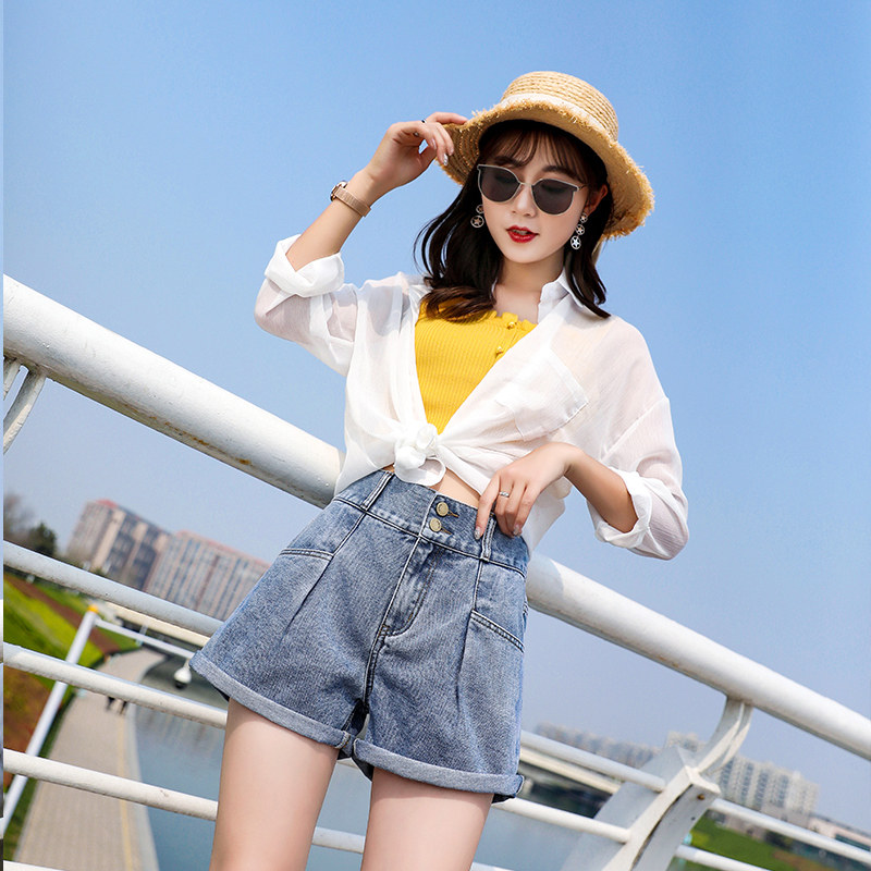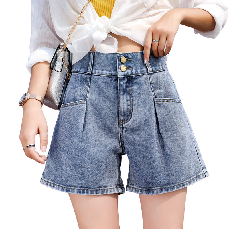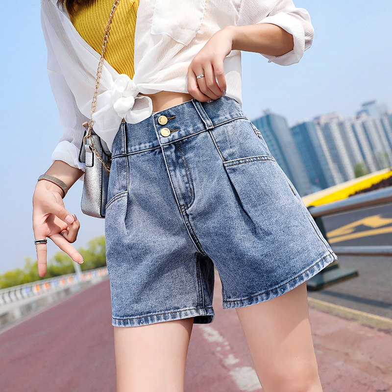 2022 Summer new web Red denim shorts female loose with slim tall waist and thin outside wearing broadleg a word hot pants