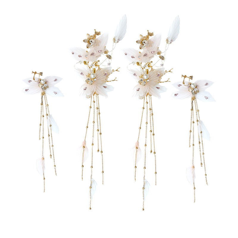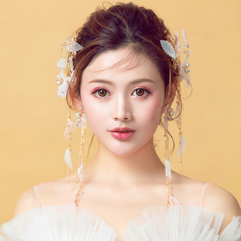 Cute bride super fairy girl nude pink silk yarn Korean sweet long tassel pair clip wedding headdress earrings set