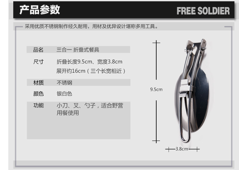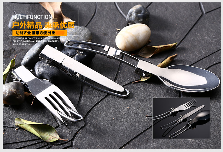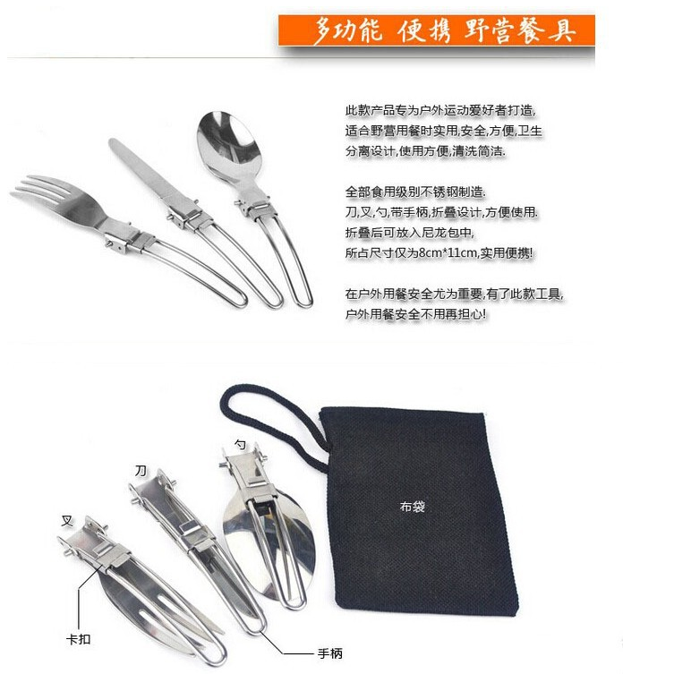 Three-piece set of convenient outdoor stainless steel folding knife, fork and spoon with locking three-in-one folding camping tableware