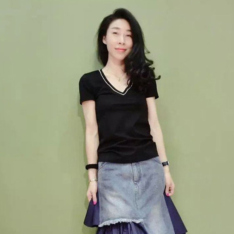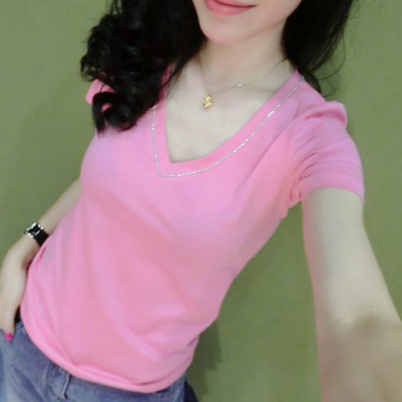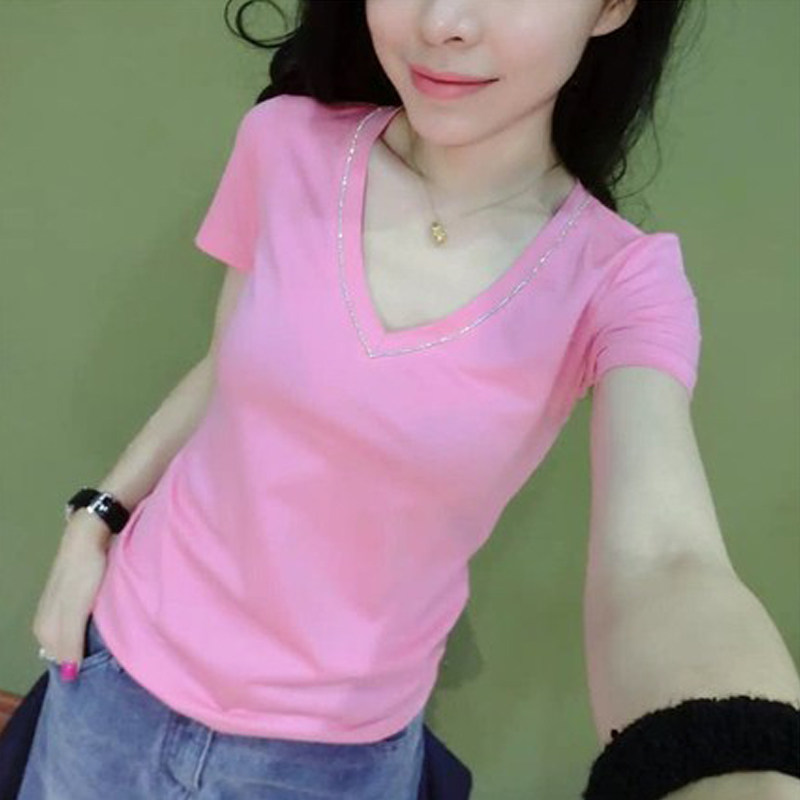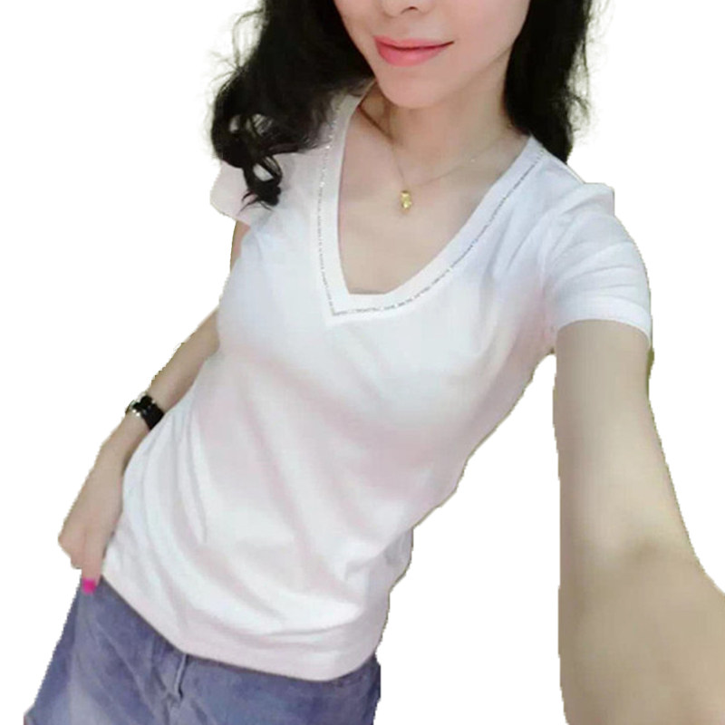 European station short-sleeved t-shirt female 2023 new fashion diamond white V-neck top female summer Korean version bottoming shirt T-shirt