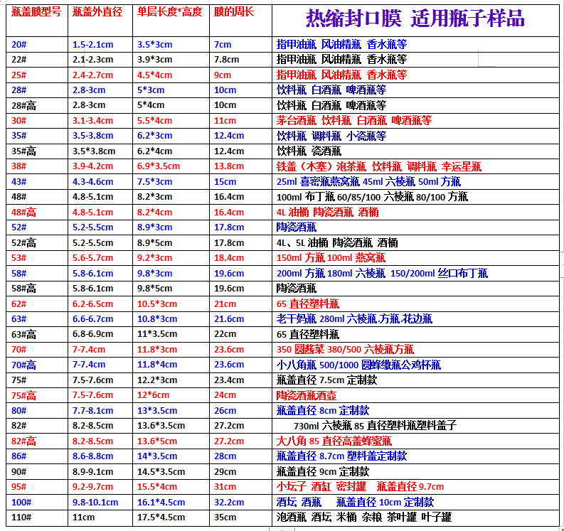 20#22# film (applicable to bottle cap 1 5-2 3cm) 25#28#30#35# (diameter 2 4-3 8cm) 38# film (applicable to bottle cap diameter 3