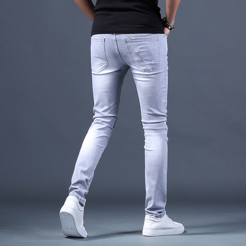 Tide brand summer style ripped printed jeans men's beggars slim fit all-match elastic trend light color small feet casual pants