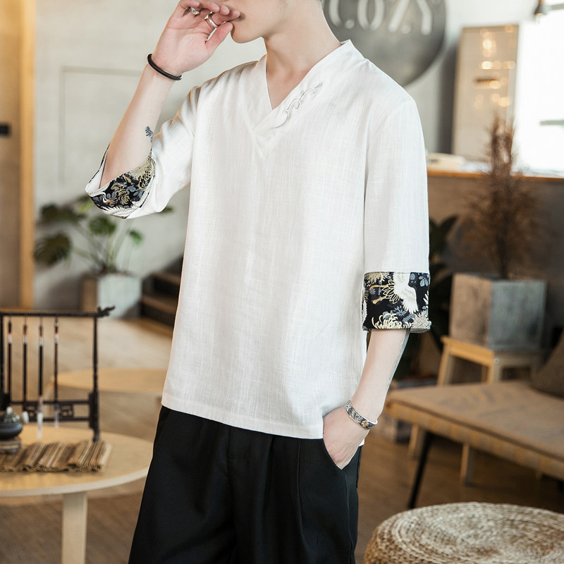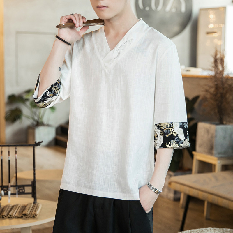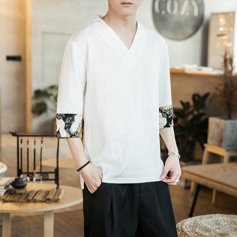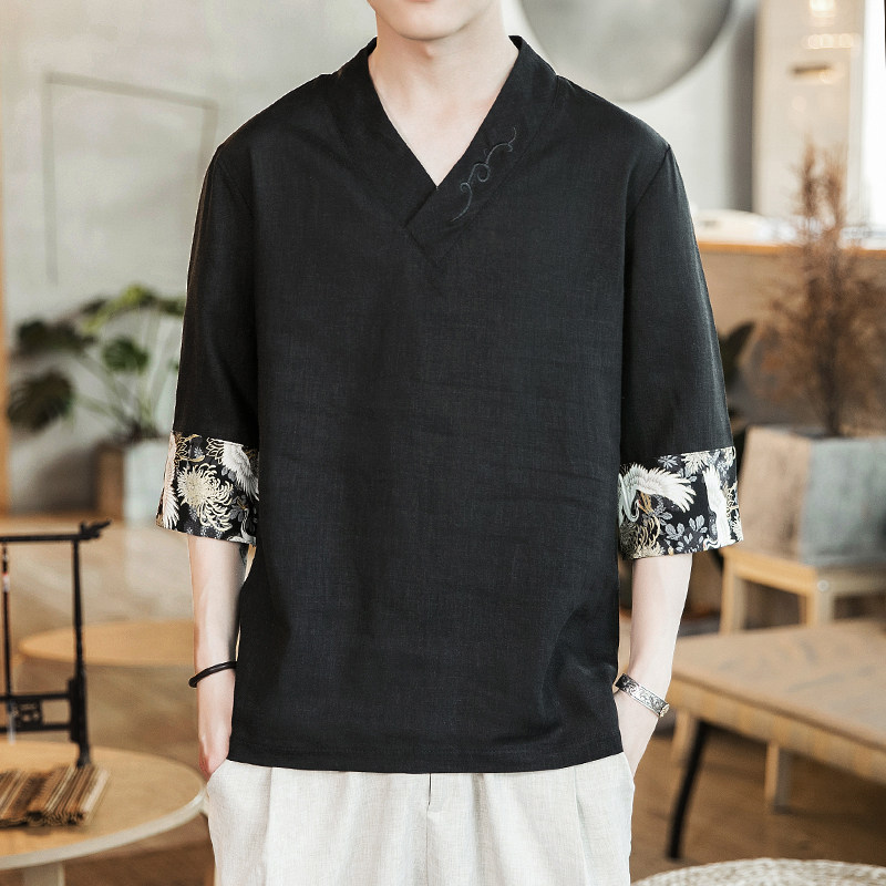 Chinese Wind Men Short Sleeve TT Shirt V-Linen Down Fluid Cushion Summer Thin T-shirt