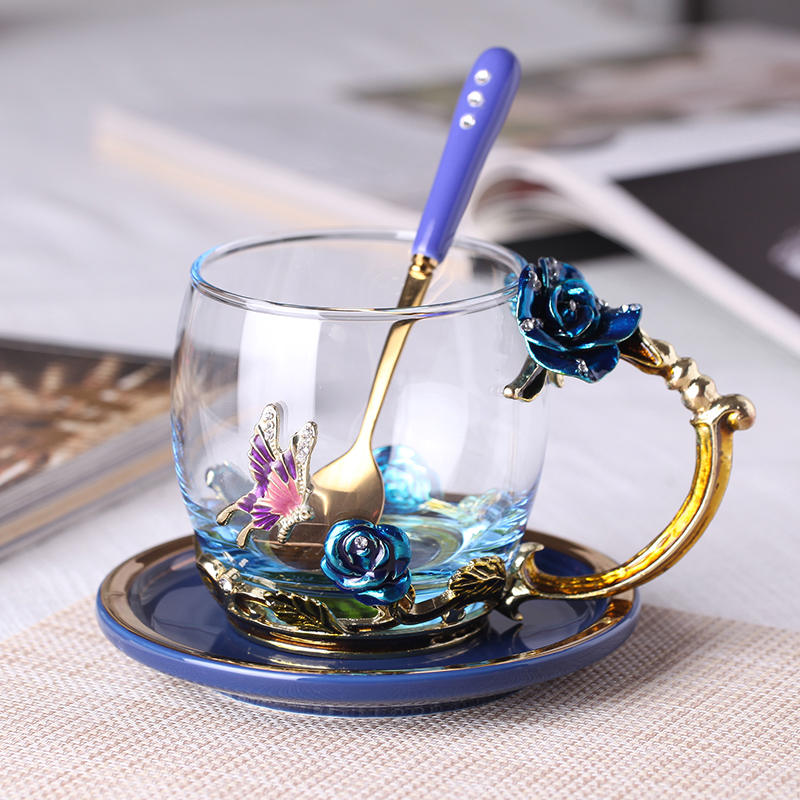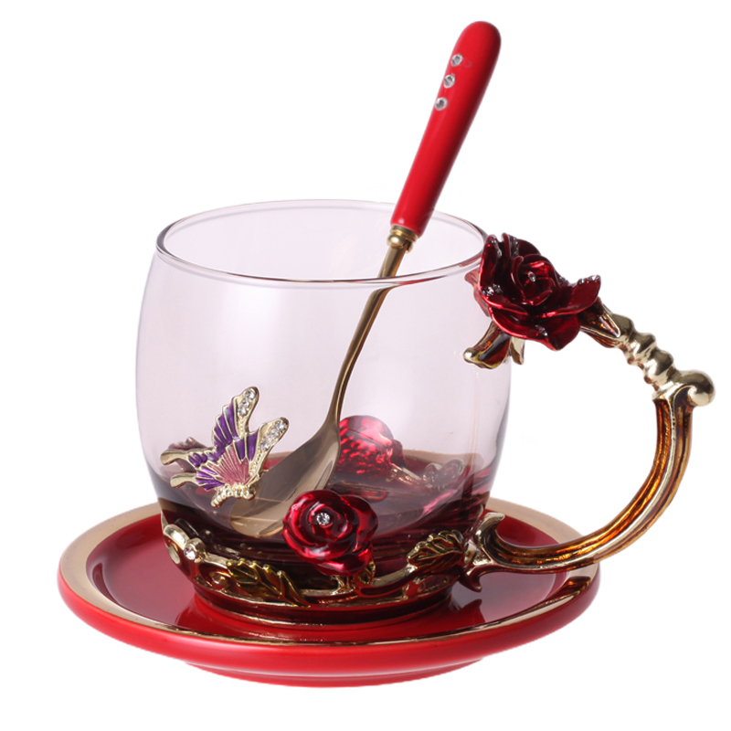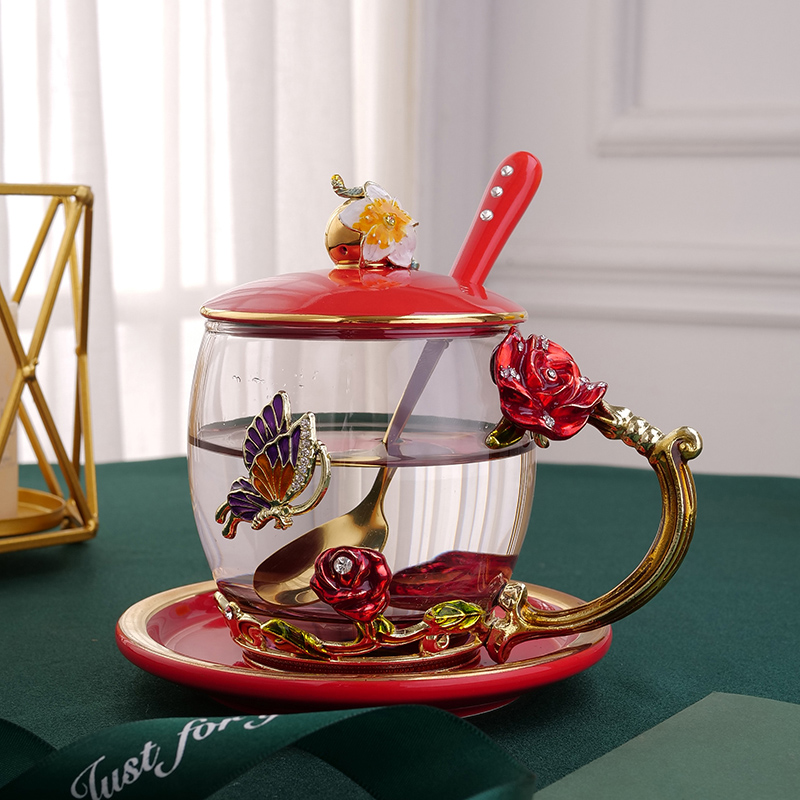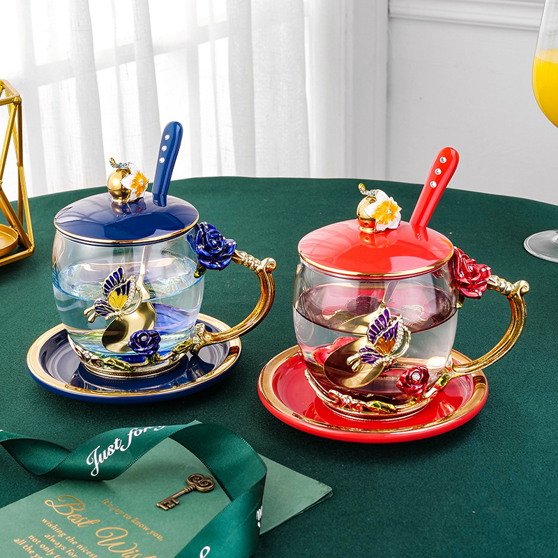 Tao Li Xuan creative enamel water cup with spoon and dish coffee cup soft girl cup girl heart glass cup flower tea cup