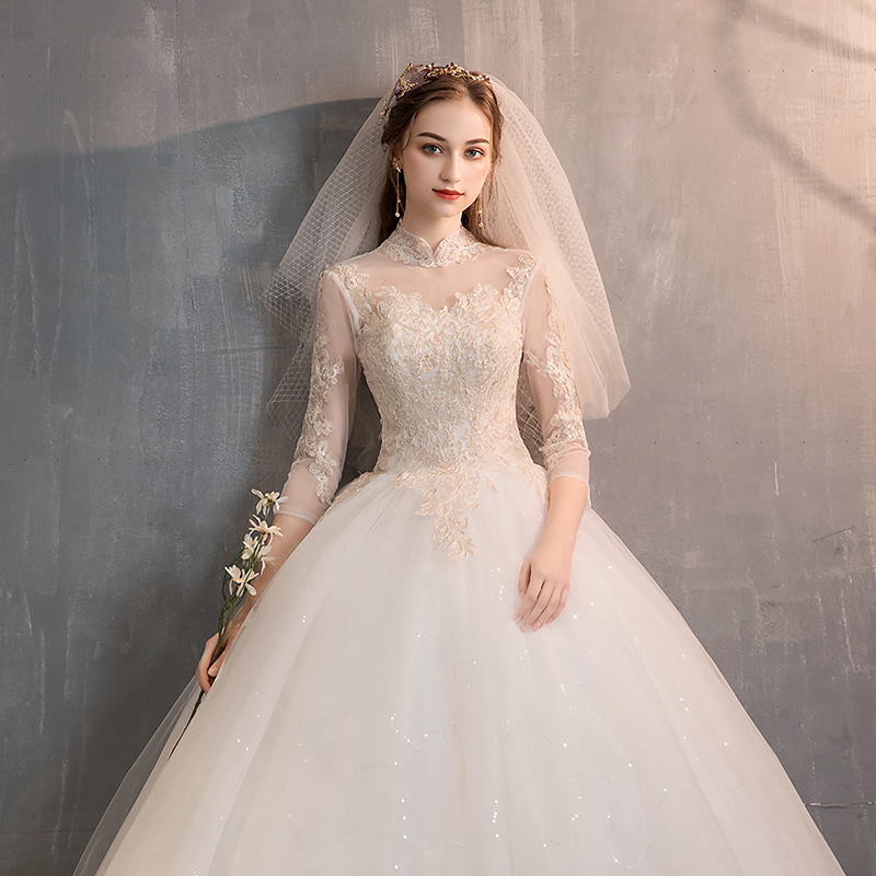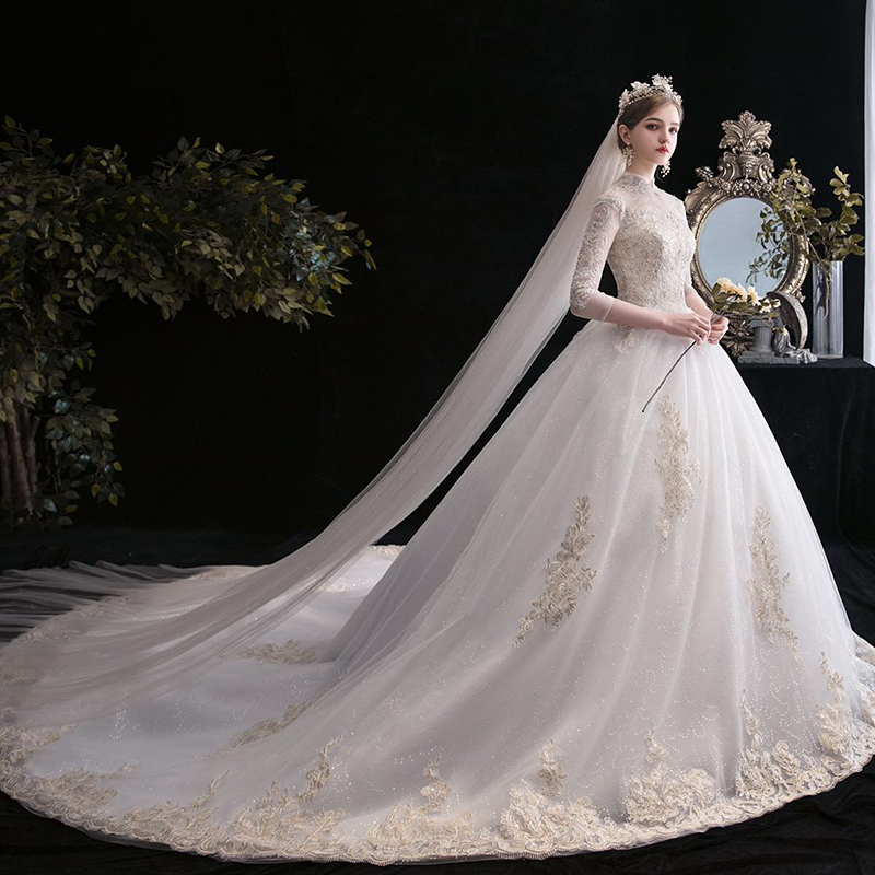 Light wedding dress 2021 new temperament tail tail bride word shoulder long sleeves look thin Qi Di Sen main yarn autumn and winter