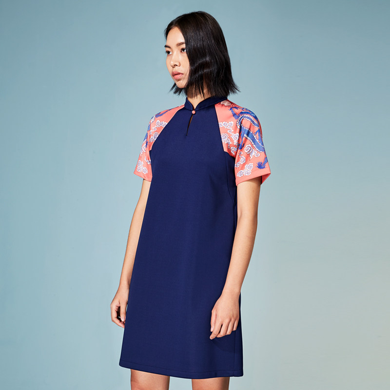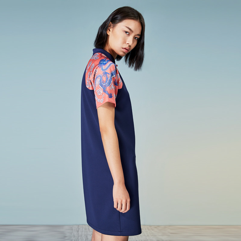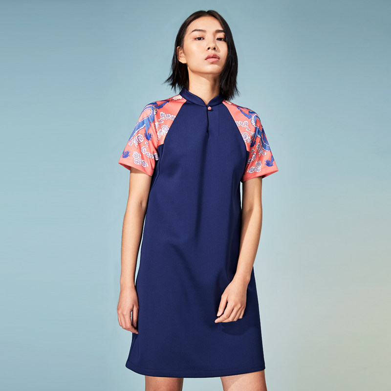 (mustard original) Longyang China Wind upright collar disc button Collision Color Printing Foreign Dress Female Midstyle Improved Qipao