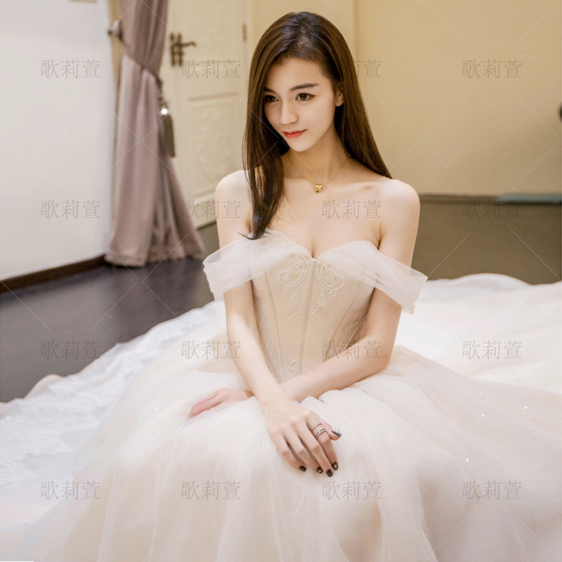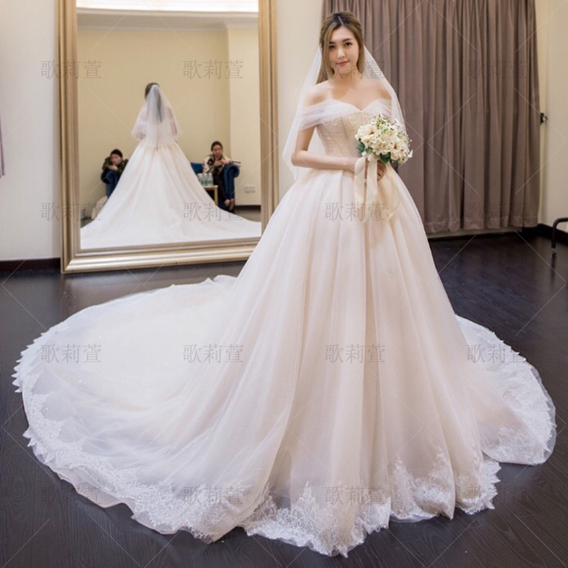 Straight Shoulder Wedding Dresses 2022 New Temperament Bride female French Princess Jane Yoo Wonderland long trailing light