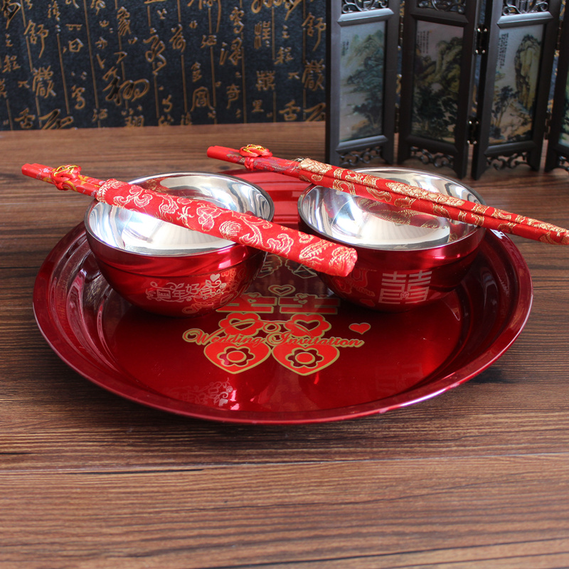 2 pairs of dragon and phoenix chopsticks, 2 pairs of stainless steel double-layer cartoon bowls, 1 pair of wine red stainless steel bowls, 2 pairs of stainless steel cartoon bowls, 2 pairs of chopsticks, 2 wine red stainless steel bowls, 2 pairs of chopsticks, 30 tea trays, 1 card, 2 cards