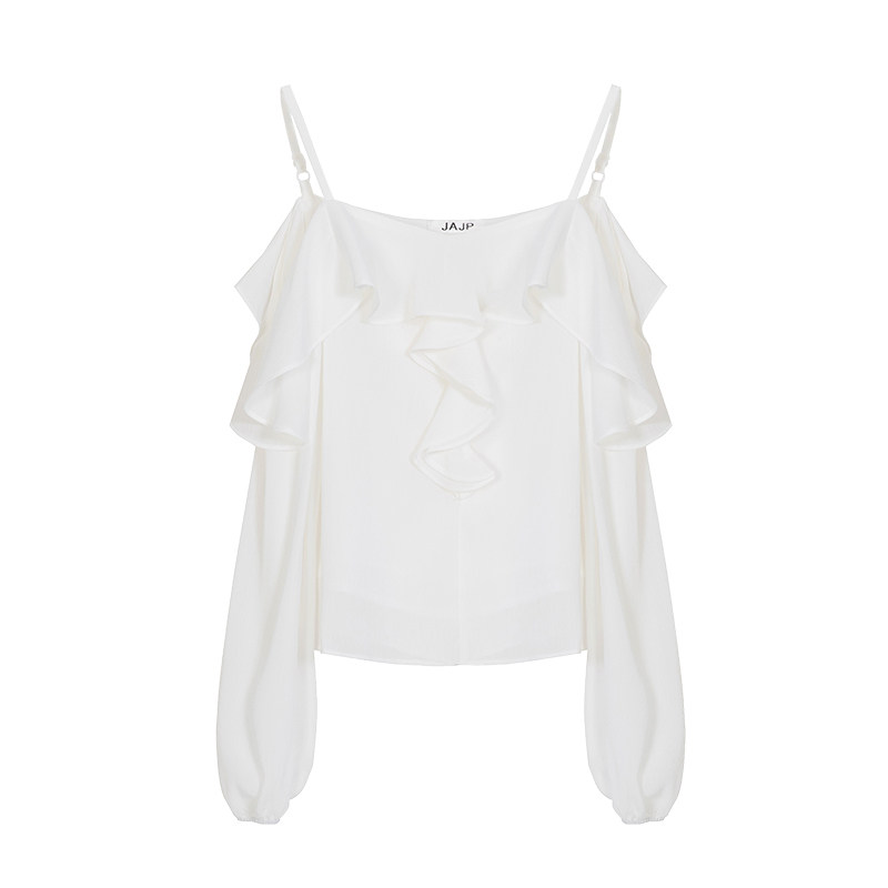 Off-the-shoulder top female net red word shoulder collarbone 2022 early autumn women's suspender ruffle fairy gas leaky shoulder chiffon shirt