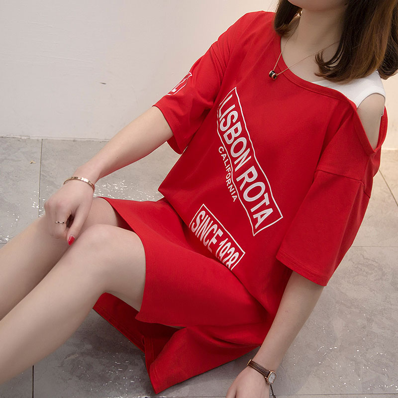 Treasure Mother Dress 2019 New Tide T-shirt Woman Short Sleeve Loose large size Shoulders Han Van Drain Shoulder-to-shoulder clothes