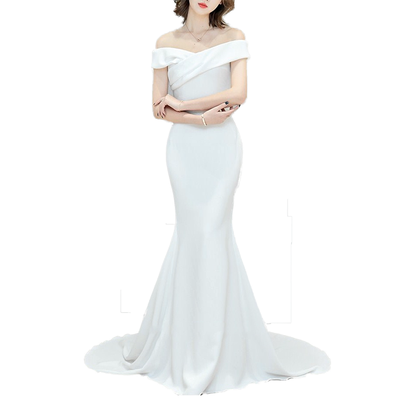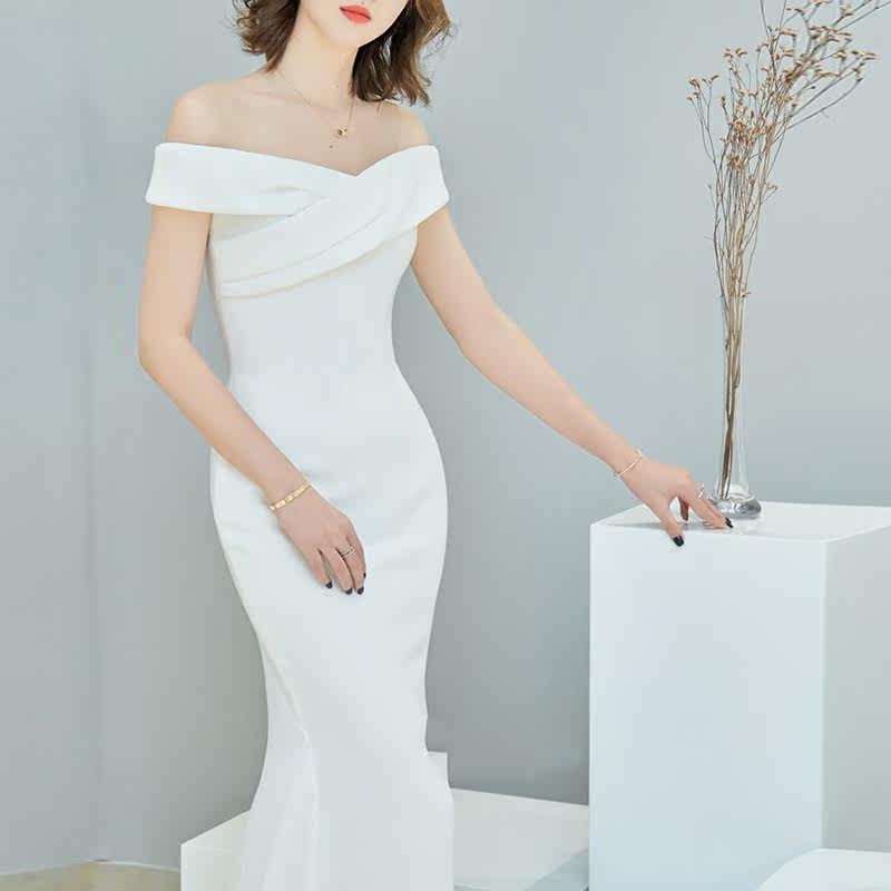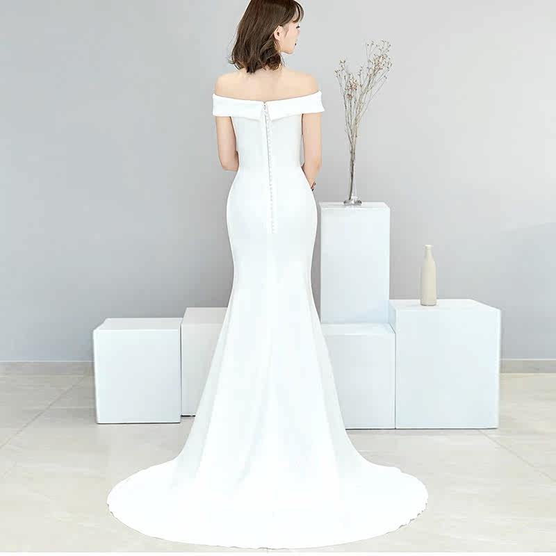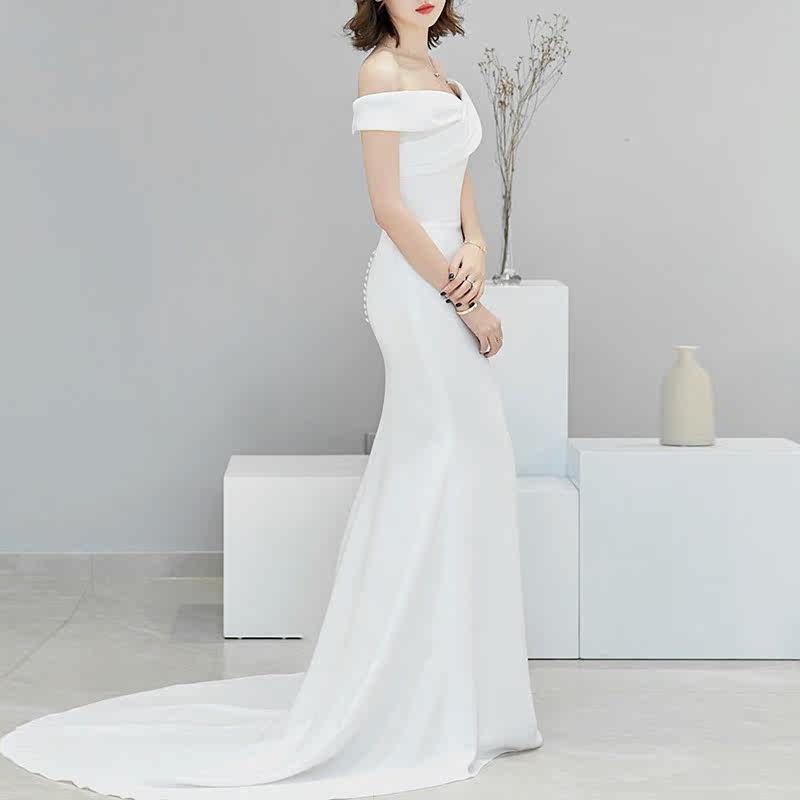 Simple light wedding dress 2020 new bride wedding forest dress long tail word shoulder out yarn woman thin summer