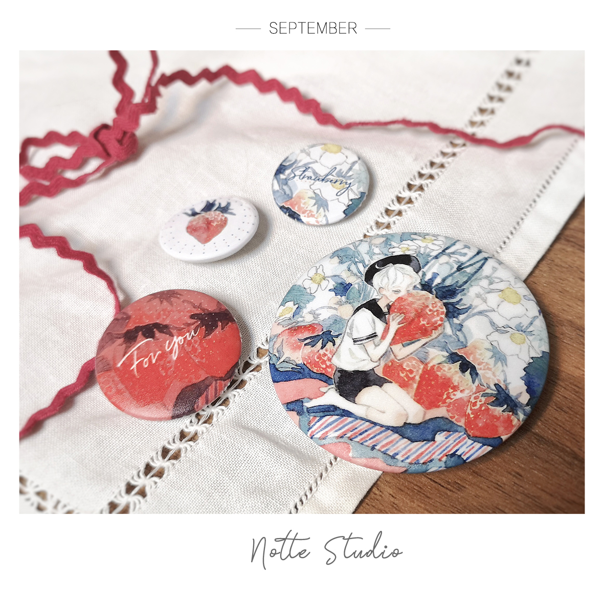 { Strawberry Boy } badge set 4 pieces into plastic bottom