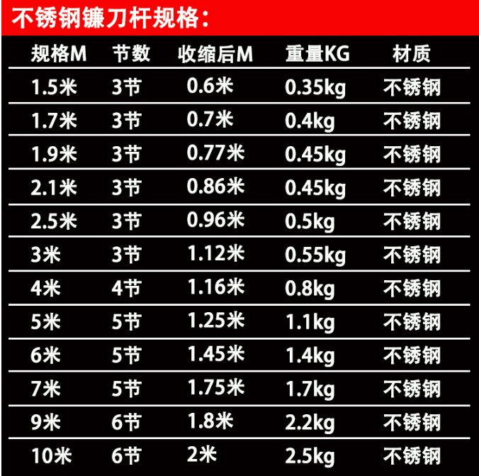 1 5 m white bar sickle (back 0 6 m) 2 5 m white bar sickle (back 0 96 m) 3 m white bar sickle (after contraction 1 12 m) 4 m white stem sickle