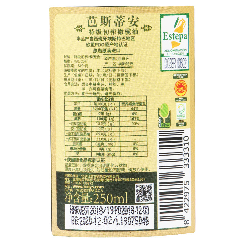 Spanish original imported Bastian PDO extra virgin olive oil 250ml