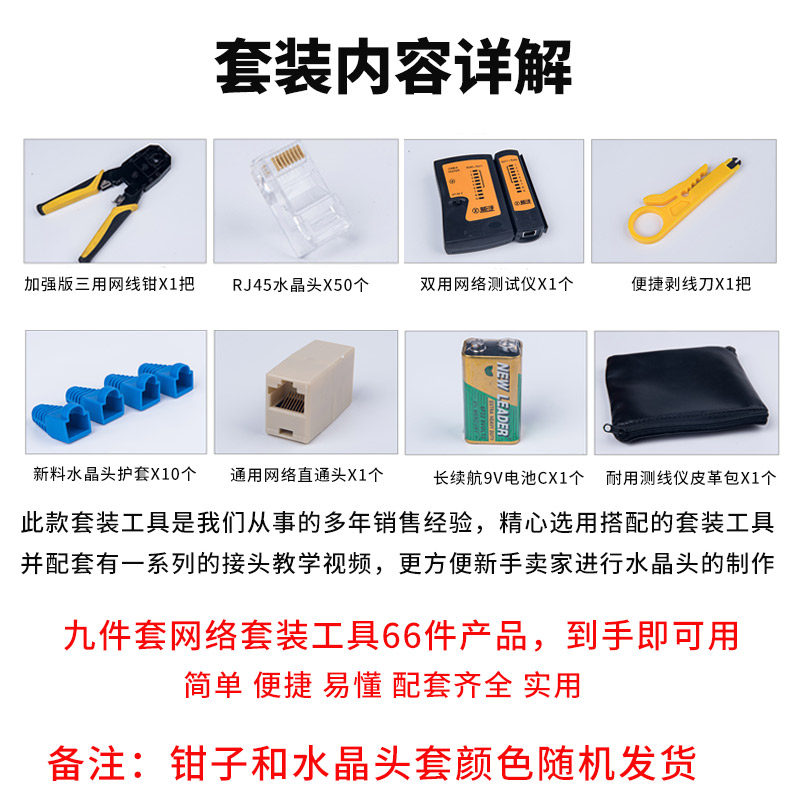 Network tool kit Network cable crimping pliers (send small yellow knife) Cable tester RJ45 crystal head (50) Super five shielded crystal head(100) Super six shielded crystal head