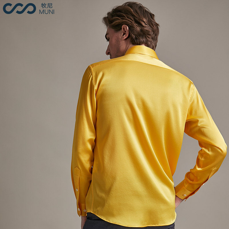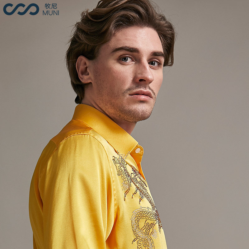 Mu Ni high-grade silk heavy weight 19 mmi silk solid color hot diamond dragon coat Men's long-sleeved shirt Mulberry silk shirt