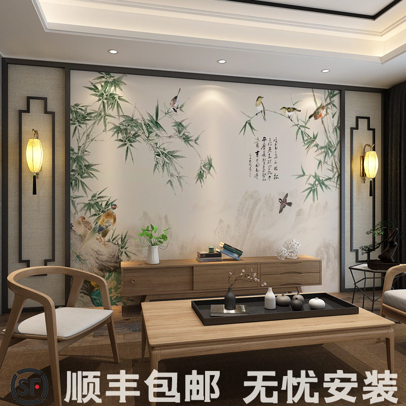 New Chinese Bamboo Flower Bird Sofa Living-room Bedside Video Seamless Background Wall Mural TV Background Wall Paper Wall Cloth